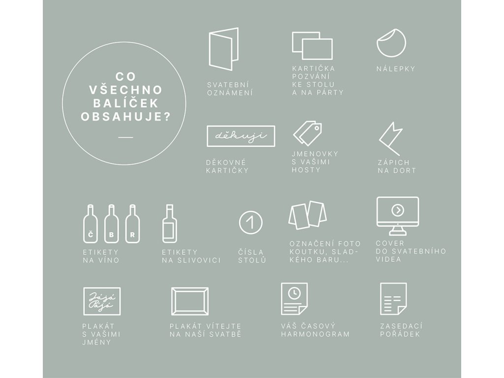 Co balíček obsahuje: Svatební oznámení, kartičky s pozváním ke svatebnímu stolu, kartičky s pozváním na párty, kulaté nálepky se jmény, etikety na víno, etikety na slivovici, plakát s vašimi jmény, plakát vítejte na svatbě, plakát časový harmonogram, plakát zasedací pořádek, čísla stolů, jmenovky se jmény vašich hostů, zápich na dort, cover do svatebního videa, děkovné kartičky.